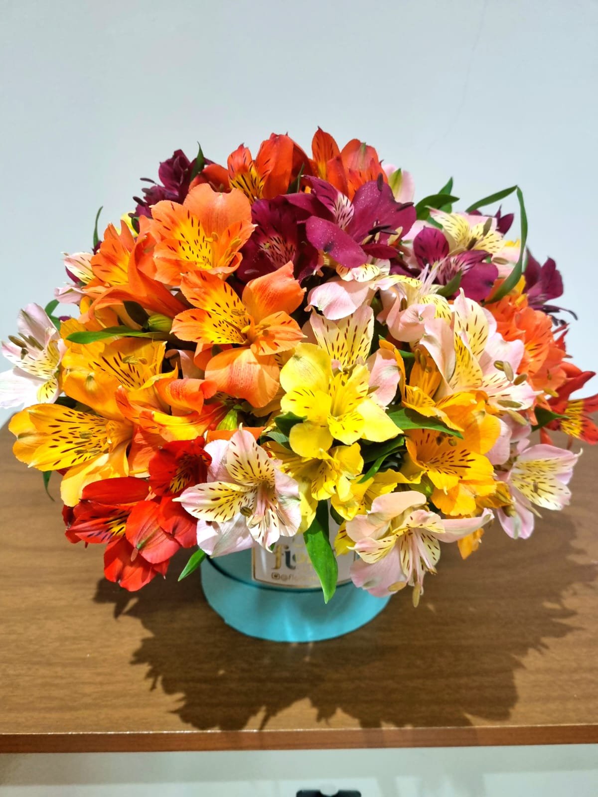 Linda Box com astromérias de cores variadas, medindo 20 cm altura x 20 cm de diâmetro (medidas total do arranjo incluindo sua base).